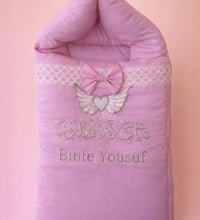 Sized at 26 x 15 inches, it offers a snug and supportive space ideal for newborns and infants, whether at home or while traveling. Designed in a sweet pink color, the nest features elegant heart and angel-inspired embroidery and can be customized with your baby’s name, making it a heartfelt keepsake and a perfect gift for newborns.