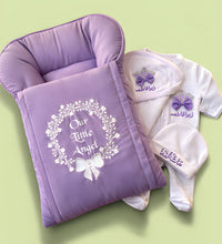 Celebrate your little one’s first days with the Purple Bow 4-Piece Set, thoughtfully designed to provide comfort, style, and endless cuddles. This adorable set includes a carry nest, soft cotton satin romper, blended fabric elements, and a charming bow detail — perfect for newborns.