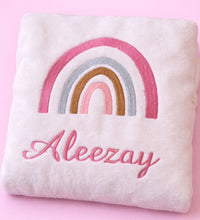 Crafted in a classic white color, it features a charming rainbow embroidery design that adds a sweet and cheerful detail. The blanket can be customized with your baby’s name, making it a beautiful keepsake and a thoughtful gift for newborns, baby showers, and special occasions.