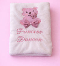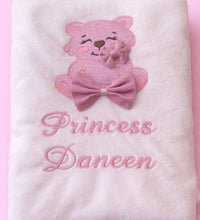 Crafted in a soothing white color, it features an adorable pink bear embroidery design that adds a sweet and elegant touch. The blanket can be customized with your baby’s name, making it a beautiful keepsake and a perfect gift for newborns, baby showers, or special occasions.